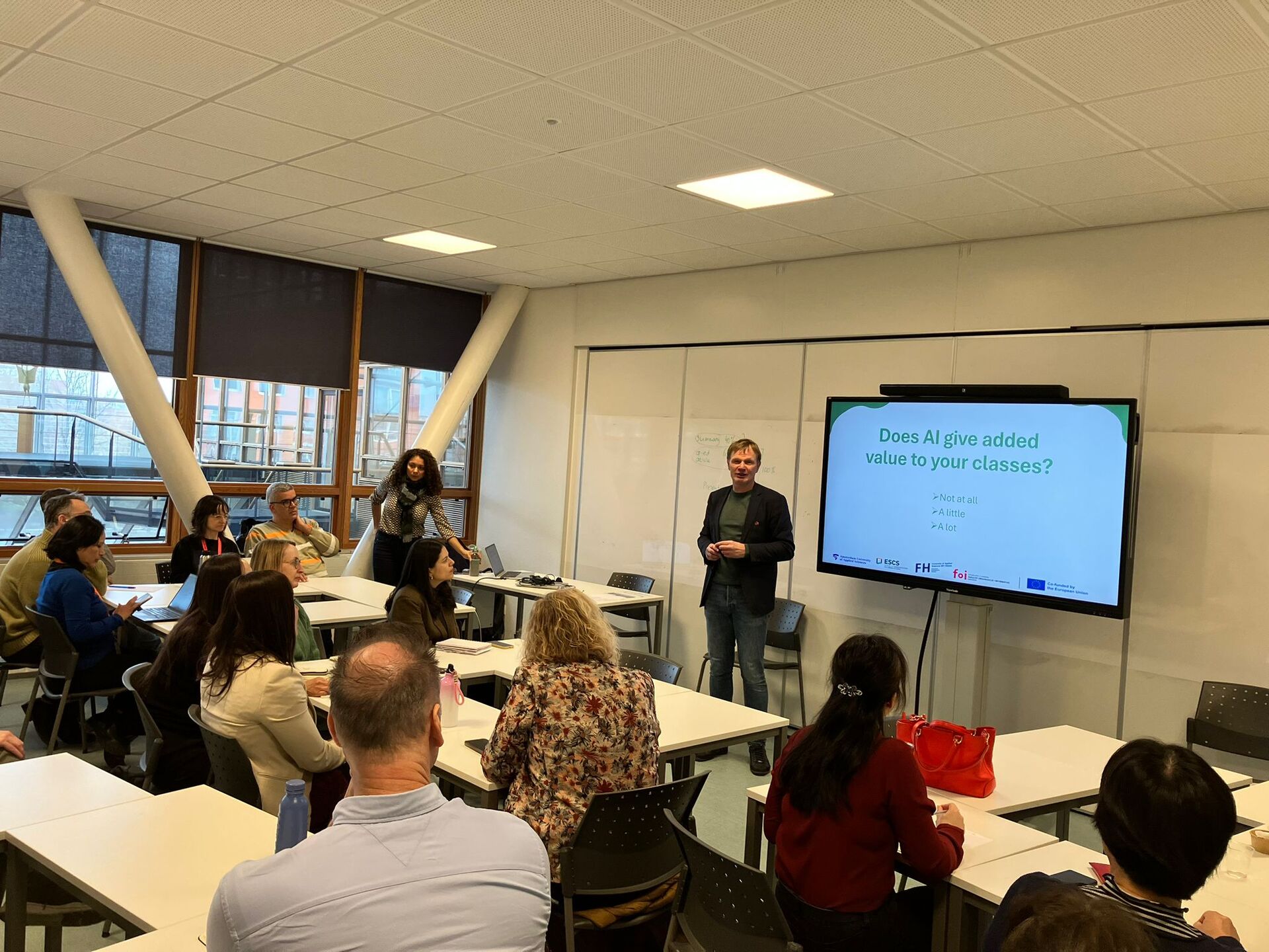 The session included a discussion titled “In what way would you integrate AI into one of your own courses?”, where participants reflected on their own teaching contexts. Collaborative exchange of impressions, challenges, recommendations, and peer advice were part of this workshop.