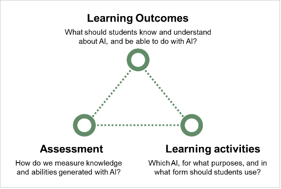 Constructive alignment is an effective technique to create pedagogically sound courses. It means systematically aligning the core elements of teaching - learning outcomes, learning activities, and assessment - with one another. When integrating AI into a course, it is crucial to think about the purpose of AI and how students can best utilize it to achieve the intended learning outcomes.